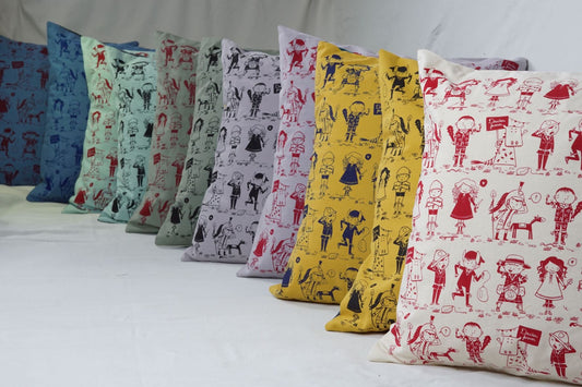 Housse de coussin "Doudou Forever"- Vert d'eau, personnages rouges